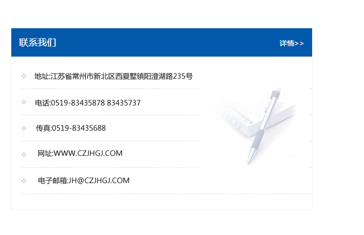 地址:常州市新北區友邦商務大廈1幢16、17層  電話:0519-85101652  傳真:0519-85112595  郵編:213022  網址:www_cz-jiayue_cn.meixunshe.com  郵箱:xiajifengaa@163.com